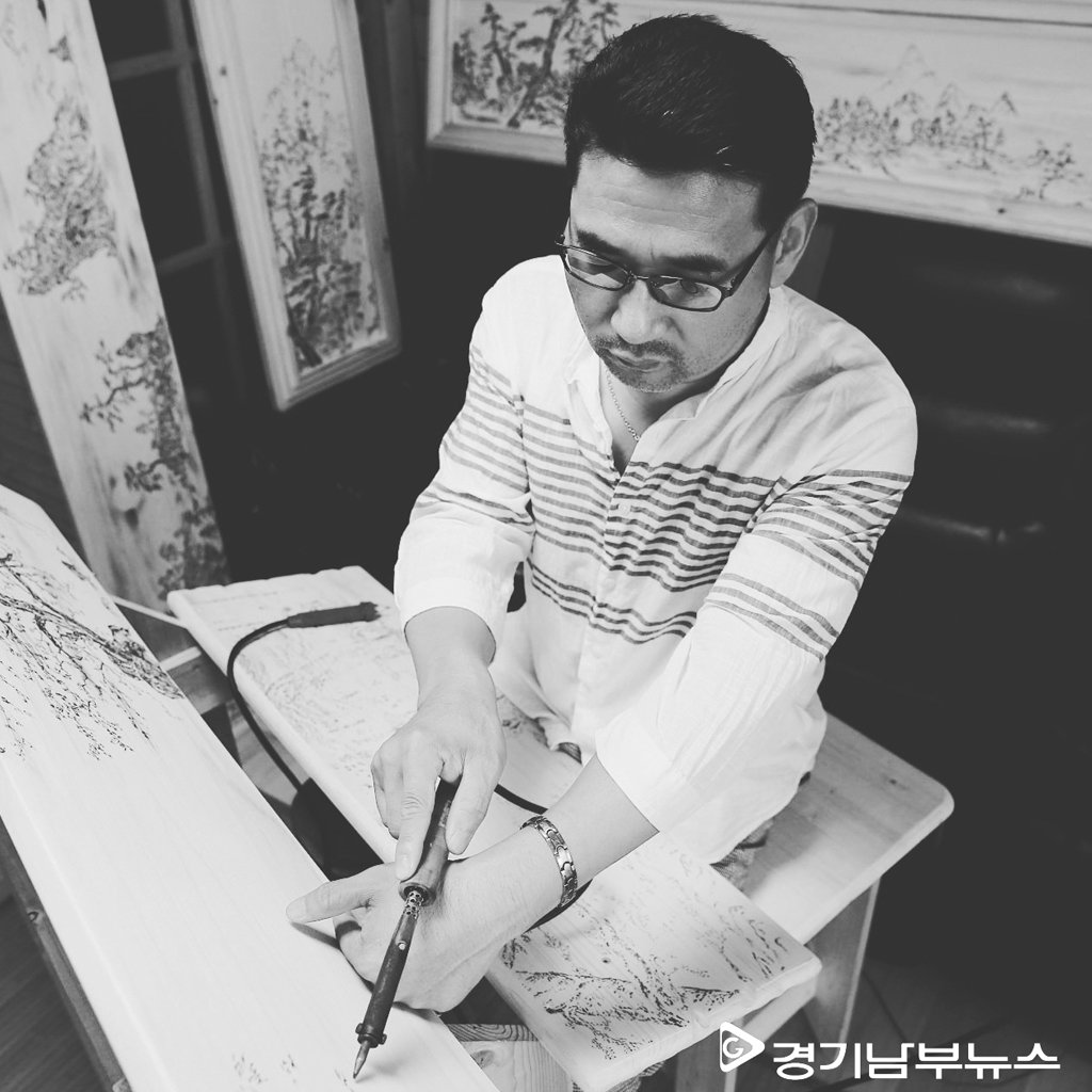 쇠로 된 인두를 뜨겁게 달구어 그림을 그리는 예술 인두화는 나무, 대나무, 가죽, 상뿔 등이 주재료로 쓰인다. 사진: 이수 작가 제공