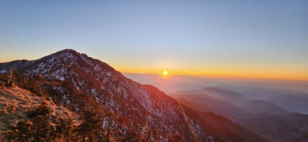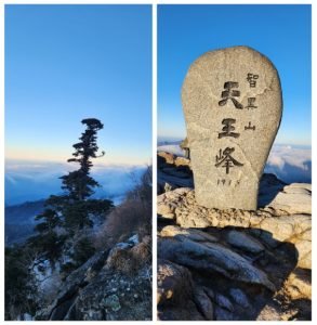 마침내 천왕봉에 도달했다. 눈부시게 밝아오는 일출을 맞이하면서, 나는 이 순간의 아름다움을 온몸으로 느꼈다. 고요한 자연 속에서, 마치 시간을 잊은 듯한 기분에 잠시 빠져들었다. 천왕봉에서 인증샷을 찍고 나서는 킬바위삼거리로 하산을 시작했다.