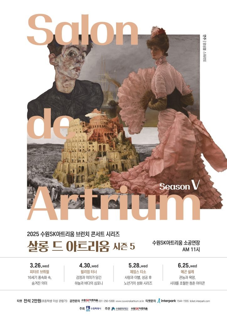 수원문화재단은 3월부터 6월까지 매달 마지막 주 수요일 오전 11시에 수원SK아트리움에서 브런치 콘서트 시리즈 <살롱 드 아트리움Ⅴ>를 개최한다고 밝혔다. 이번 시리즈는 미술과 음악을 결합한 독특한 공연으로, 16세기부터 20세기까지 미술사에 중요한 영향을 미친 피터르 브뤼헐, 윌리엄 터너, 제임스 티소, 에곤 쉴레 등 총 4명의 화가들을 조명한다.