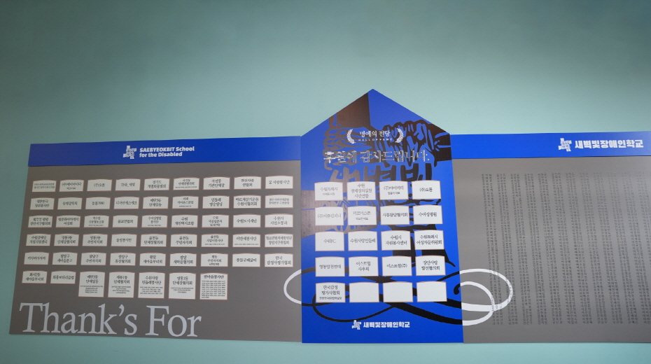 수여성병원 3층에서 엘리베이터 문이 열리면 ‘새벽빛 장애인학교’라는 큰 대문이 한눈에 보인다. 장애인 학생들을 반갑게 맞는 입구인 로비는 휠체어끼리 부딪히지 않고 교행할 수 있을 정도로 넓게 마련됐다. 로비 왼쪽 벽면에는‘명예의 전당’이 설치돼 눈길을 끈다. ‘후원에 감사드립니다’라는 문구를 중심으로 새벽빛 장애인야학 이전을 위해 마음과 성의를 모은 수원지역의 단체와 기관, 개인 후원자들의 이름이 벽면 가득 빼곡하게 담겼다.