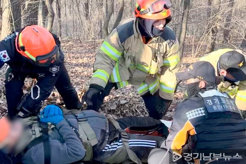 신고를 받은 용인소방서 역북119안전센터와 구조대 등 총 12명의 대원은 약 30분간 수색 끝에 50대 남성 A 씨를 발견하고 안전하게 구조했다. 당시 이 남성은 정강이 골절로 추정되는 부상으로 거동이 불가능한 상황이었다. 가파른 경사와 녹지 않은 얼음으로 인해 구조 과정에서 어려움이 있었지만, 대원들의 침착한 대처로 들것을 이용해 무사히 하산했다.