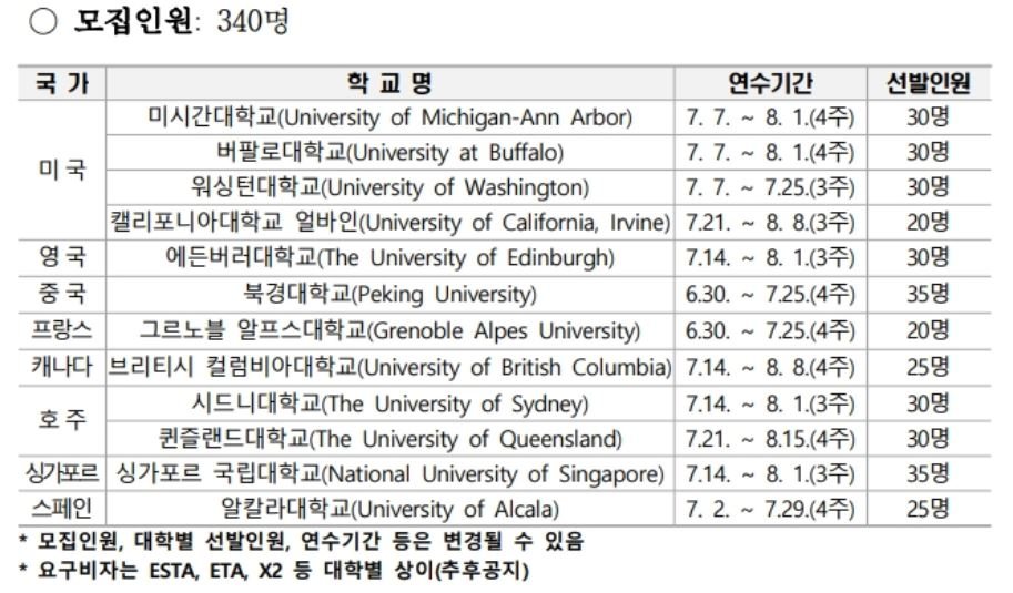 전체 모집인원은 340명이며 6월 30일을 시작으로 8월 8일까지 약 3주 또는 4주간 진행된다. 연수기간은 대학별로 상이하니 꼭 확인해야 한다.