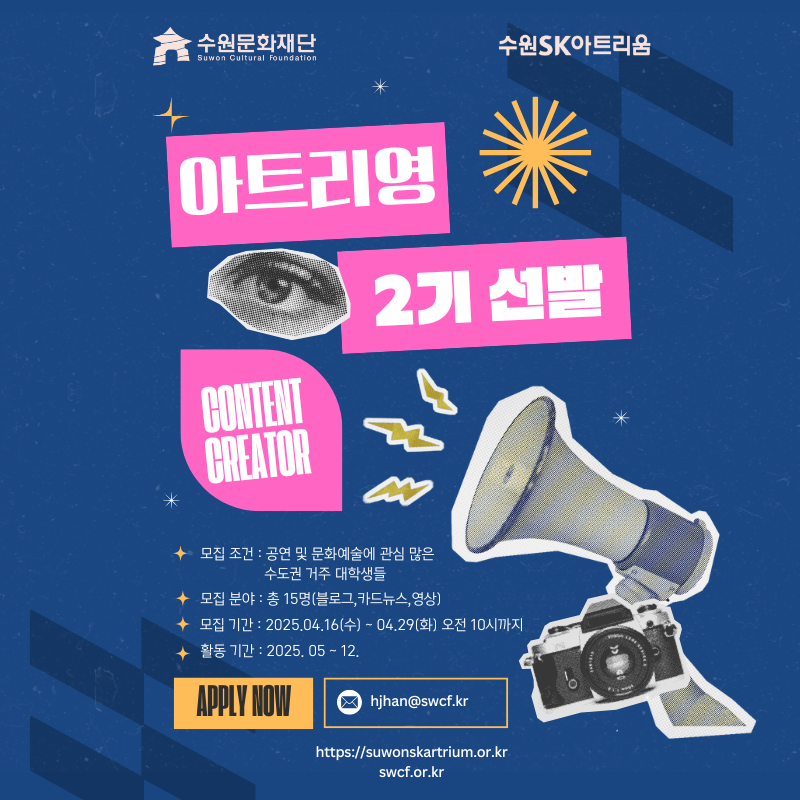 재단 관계자는 “이번 아트리영 2기 모집은 대학생들이 직접 수원SK아트리움의 공연을 알릴 수 있는 좋은 기회가 될 것이다”라며 “문화예술 분야에 관심이 있는 학생들이 주도적으로 공연을 홍보할 수 있도록 다양한 지원을 아끼지 않겠다”고 밝혔다. 접수는 오는 16일부터 29일 오전 10시까지 이메일(hjhan@swcf.kr) 접수로 진행하며, 지원자들은 지원서와 개인정보수집동의서를 필수로 제출해야 한다. 홍보 능력을 보여줄 수 있는 포트폴리오를 추가로 제출하면 선발에 유리하다. 재단은지원자의 콘텐츠 제작 능력과 SNS 활용 능력을 종합적으로 평가할 계획이다.