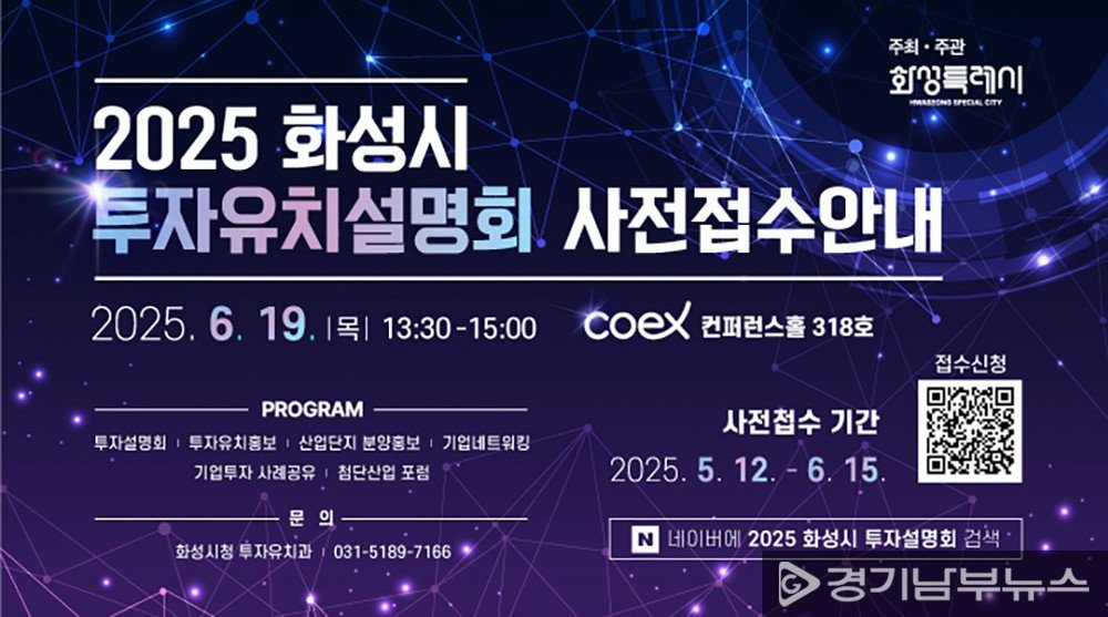 화성특례시(시장 정명근)가 5월 12일부터 6월 15일까지 ‘2025 화성시 투자유치 설명회’를 위한 사전접수를 진행한다고 밝혔다. 이번 설명회는 6월 19일 서울 코엑스에서 개최되며, 사전접수를 완료한 기업 중 주요 150여 개 기업을 초청해 화성시의 투자환경을 소개하고, 산업단지 분양 홍보 및 개별 상담을 진행할 예정이다.
