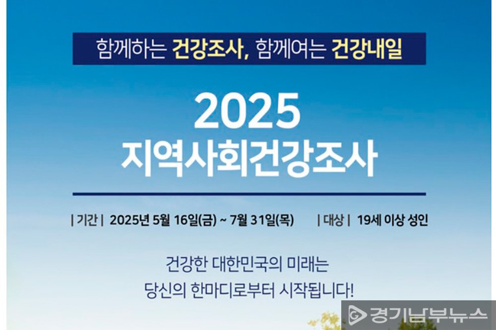 평택시(시장 정장선)는 오는 5월 16일부터 7월 31일까지 2025년 지역사회건강조사를 실시한다. 성균관대학교 산학협력단과 함께 진행되며, 평택시민의 건강 수준을 파악하고 지역 보건 정책 수립에 필요한 기초자료를 마련하기 위하기 위해 진행된다.