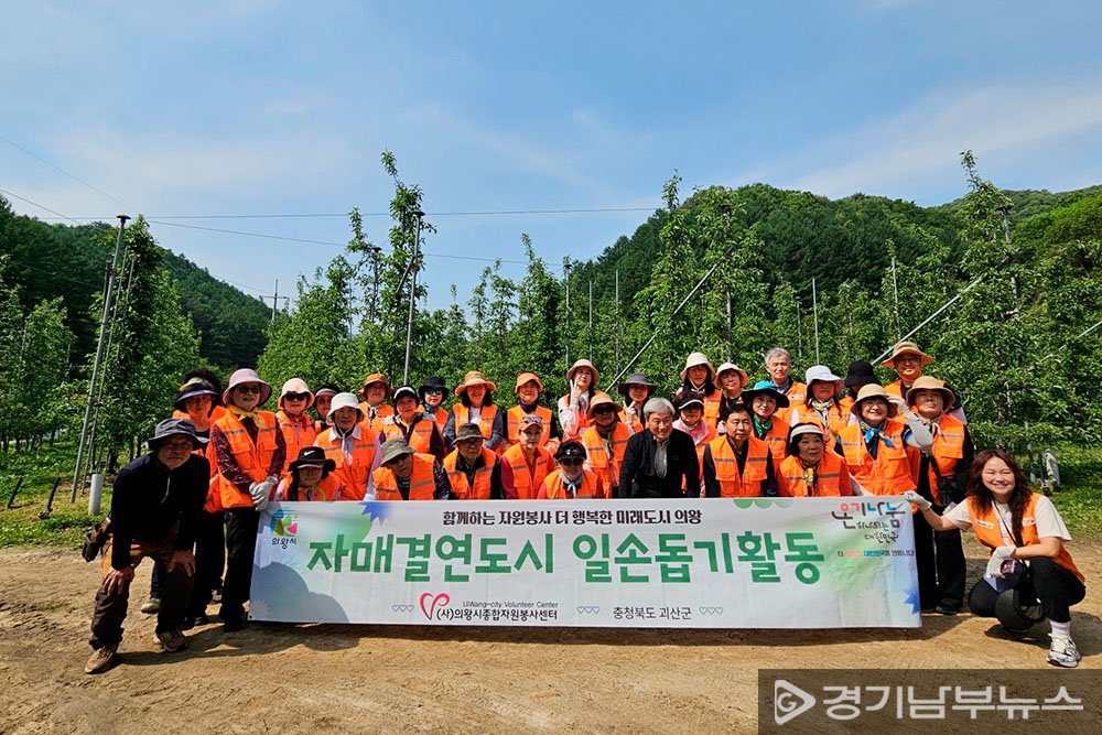 의왕시자원봉사자센터에서 지난 13일 의왕시 자원봉사자 30여명이 자매결연 도시인 충북 괴산군에 방문해 농촌봉사활동을 진행했다. 이번 봉사활동에서는 사과 적과(열매 솎기) 작업을 함께하는 등 영농철 바쁜 농가의 일손을 도왔다.