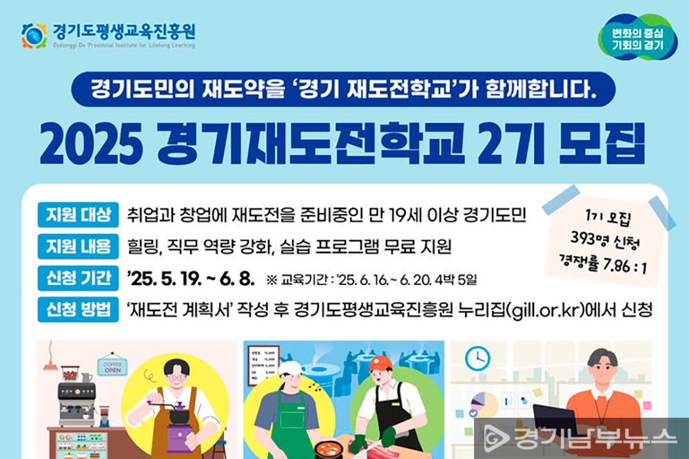 참가 대상은 경기도에 거주하는 만 19세 이상 도민 중 취업 또는 창업에 실패한 경험이 있거나, 재기를 준비 중인 사람이다. 신청은 경기도평생교육진흥원 누리집(gill.or.kr)을 통해 ‘재도전 계획서’를 제출하면 되며, 서류 심사를 통해 최종 50명을 선발한다.