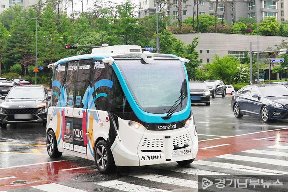 수원시 영통구 광교지구 중심지를 시험 운행 중인 자율주행 차량이 정지 신호에 정차하고 있다.