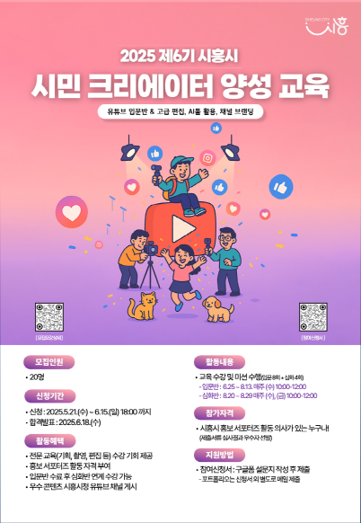 시흥시는 다양한 영상 기획물을 통해 시정 소식을 시민에게 더욱 쉽고 재미있게 전달하기 위해 ‘2025 제6기 시민 크리에이터 양성 교육’ 참가자 20명을 지난 21일부터 6월 16일까지 모집한다.