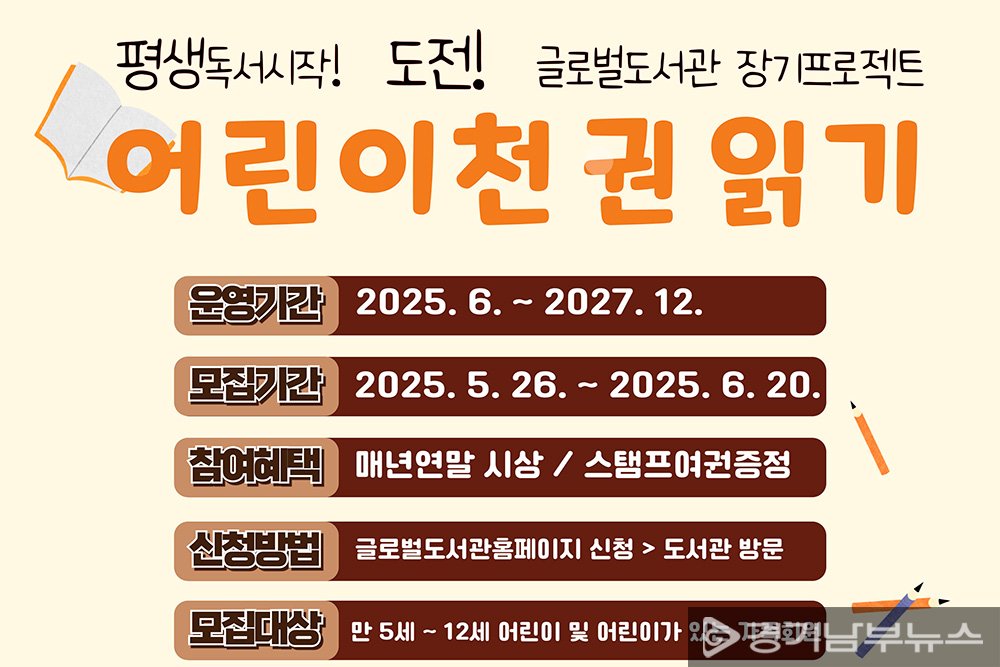 의왕시 글로벌도서관이 어린이 독서 습관 형성을 위한 장기 프로젝트인 ‘글로벌도서관 어린이 천 권 읽기’를 시작한다. 이 사업은 경기도 주관 ‘어린이 1,000책 탐험대’의 일환으로, 5세부터 12세까지 어린이와 그 가족회원들을 대상으로 진행된다.