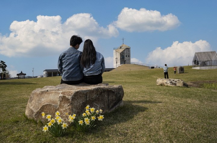 작품 속의 배경은 충남 당진의 신리성지이다. 고즈넉한 잔디밭에 평화로이 뛰어노는 아빠와 아들이 보이고 미래의 가족을 꾸려놓을 연인들의 모습도 보인다. 노란 수선화가 활짝 핀 돌 위에 사랑스러워보이는 두 명의 학생이 다정히 앉아 이야기를 나누고 있다. 뒷모습만 촬영하겠다는 양해를 구하고 찰칵!! 스냅으로 촬영한다. 앞으로도 이쁜 사랑하며 평생연인으로 행복한 가정을 이뤘으면 하는 바램으로 그들의 휴대폰으로도 찍어주었다.