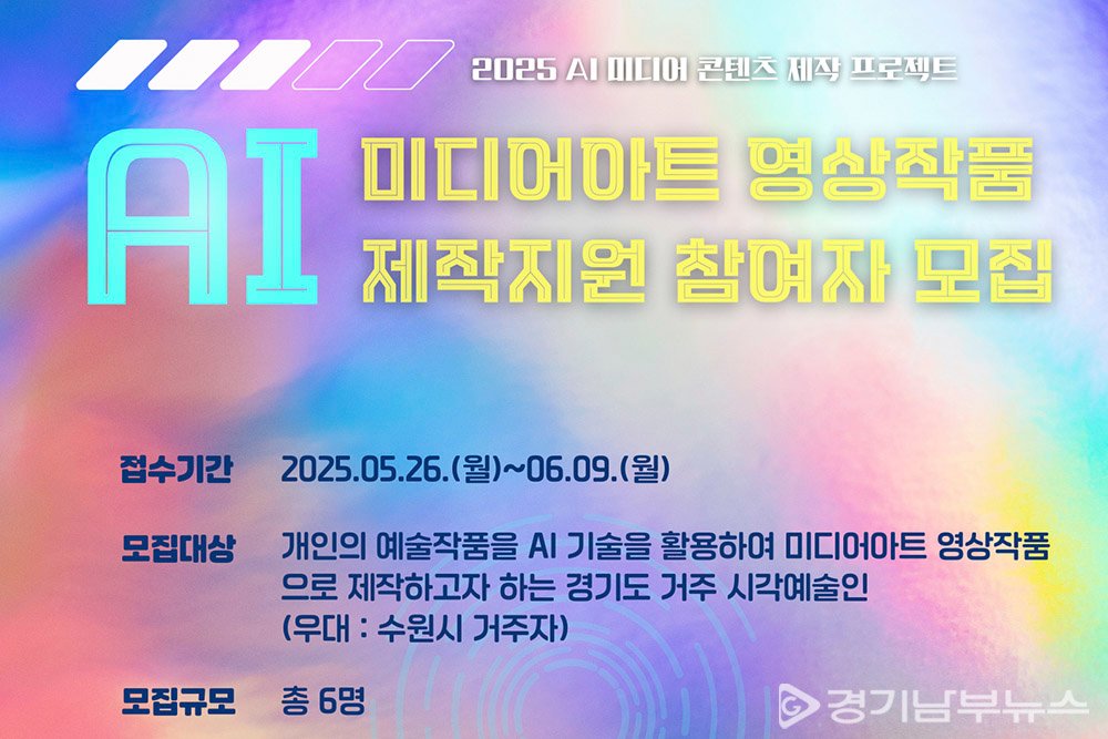 수원문화재단 수원시미디어센터는 오는 **6월 9일(일)**까지 ‘AI 미디어 콘텐츠 제작 프로젝트 _ AI 미디어아트 영상작품 제작지원’ 사업의 참여자를 공개 모집한다.