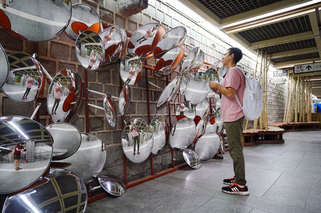 무더위가 한창이던 어느 여름방학의 7월 말에 경복궁을 가기 위해 전철역으로 향했다. 목적지인 경복궁역을 가기 위해서 전철과 지하철로 환승하며 3호선 경복궁역사에 이르렀을 때 둥근 원형 거울의 조형물이 눈에 띄었다. 멋스럽게 설치되어 신기한 듯 바라보며 카메라로 담고 있을 무렵, 때마침 거울 앞을 지나가던 외국인 청년 또한 신기한 듯 자신의 폰으로 요리조리 각도를 바꿔가며 찍고 있는 모습이 포착되어 셔터를 마구 눌러버렸다.