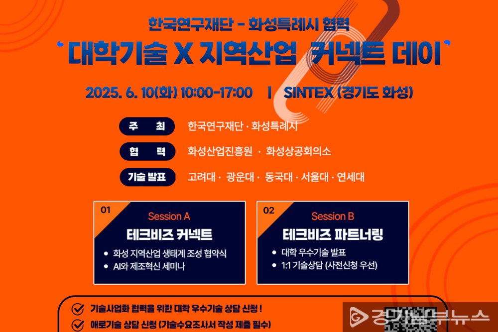 화성특례시(시장 정명근)는 오는 6월 10일 신텍스 그랜드볼룸홀에서 ‘대학기술-지역산업 커넥트데이’를 한국연구재단과 공동 개최한다. 이번 행사는 국내 대학이 보유한 첨단 기술과 화성시 관내 기업의 기술 수요를 직접 연결해 산학 협력의 시너지를 높이고자 기획됐다.