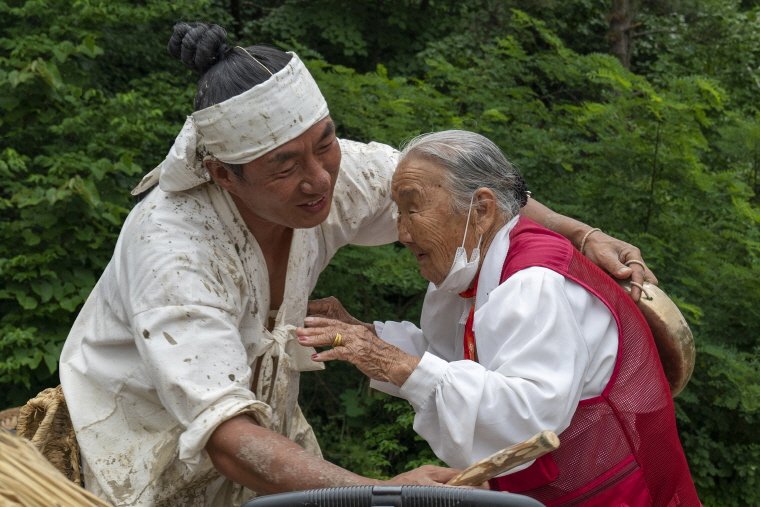 사진 속 내용을 설명하자면, 농부로 분장한 한국교원대 조진국교수와 할머님은 충북 보은군 장안면의 현지 주민이시다. 전통문화보존과 연구를 위해 꾸준히 장안면 주민들과 소통해오신 서원대 홍대 기 교수님의 활발한 작품연구의 소중한 결과물이다. 코로나 이후 2년여 기간 동안 지역 전통문화를 보존하는 행사가 축소되고 지양되다 보니 오랜만에 펼쳐진 장안면 모내기행사에 참여하는 현지 주민들의 표정도 행복감에 젖어 있었다. 연로하신 할머님이 오랜만의 행사에 지팡이 들고 둑방길을 걸어오시어 교수님과 상봉을 하는 찰나, 순간포착을 하였다. 기쁨의 목소리로 ‘아이쿠~우리어무이~~~어무이 건강하시제~~?’라고 외치는 조교수님의 목소리는 아직도 귀에 생생하게 들리는 듯하다.