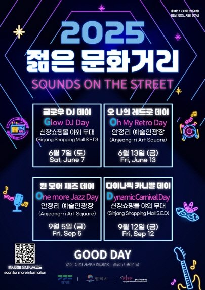 첫 행사는 6월 7일 신장쇼핑몰 야외무대에서 열리는 ‘글로우 DJ 데이(Glow DJ Day)’로 시작된다. 이어 6월 13일에는 안정리 예술인광장에서 복고 감성 가득한 ‘오 마이 레트로 데이(Oh My Retro Day)’가 진행되며, 9월에는 재즈를 테마로 한 ‘원 모어 재즈 데이(9월 5일)’와 퍼레이드 형식의 ‘다이나믹 카니발 데이(9월 12일)’가 순차적으로 개최된다.