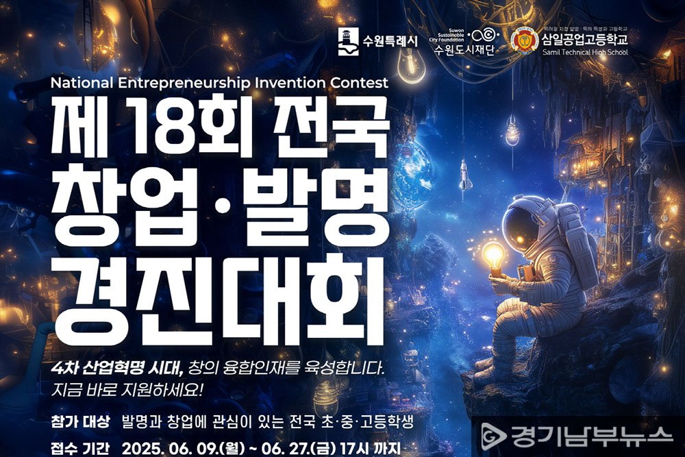 수원시는 오는 6월 9일부터 27일까지 전국 초·중·고등학생을 대상으로 ‘제18회 전국 학생 창업발명경진대회’ 참가자를 모집한다. 개인 또는 1~4인으로 구성된 팀 단위로 누구나 참여 가능하다.