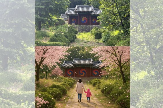 [염미영의 포토스토리 54회] 원본사진과 A I사진 / 사진: 염미영, 경기남부뉴스본 작가는 충북 청주시 오창읍에 위치한 송천서원을 지나가다가 태극문양이 들어간 사진을 한 장을 찍게 된다. 바로 이 사진(위) )이 원본으로 촬영한 지난 주의 상황이다. 카메라로 찍은 사진 한 장을 챗GPT의 프롬프트에 아래 내용의 문장을 입력해 넣어 보았다. “첨부한 사진 속의 장면에 가운데 길이 있어. 그 길 위에 엄마와 아기가 걸어가는 장면을 만들어줘. 그리고 왼쪽과 오른쪽에 벚꽃잎이 흩날리는 봄 풍경의 사진을 만들어줘. “[표준국어대사전]에 등재된 프롬프트(prompt )의 정의는 ‘ 정보통신시스템이 다음 명령이나 메시지, 또는 다른 사용자의 행동을 받아들일 준비가 되었음을 사용자에게 알려주는 메시지’라고 되어 있다. 결과는 뜻밖에도 프롬프트에 입력한 문장을 그대로 사진으로 표현해 주었다. 프롬프트의 내용에 의해 등장한 결과 사진이 아래 장면이다. 소름이 돋는다. 인간이 찍은 카메라의 장면을 A I는 아주 섬세한 영역의 표현조차 인간의 상상을 뛰어넘어서고 있다. 무거운 카메라를 언제까지 들고 다니며 찍을 수 있을까? 인간의 예술적 창의성과 A I 사진이 경쟁대열로 비교할 수 있을까? 벌써 A I에 사진 영역도 점령? 되었다고 할 수 있을까? 등등 사진작가로서 다소 암울한 상상을 이어지게 했다. A I를 사진에 응용하거나 활용하는 역이용의 발상을 예술의 창작으로 볼 수 있을 것인가? 두 대의 카메라를 앞에 놓고 보이지 않는 답을 찾고자 하는 본 작가는“ 나는 그래도 사진작가이다. ” 라고 외쳐본다.