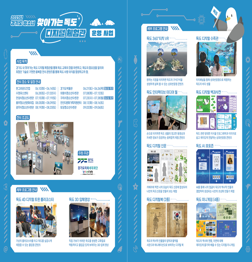 경기도와 경기도미래세대재단이 오는 6월 10일부터 9월 6일까지 도내 10개 시를 순회하며 ‘2025년 찾아가는 청소년 독도 디지털체험관’을 운영한다.