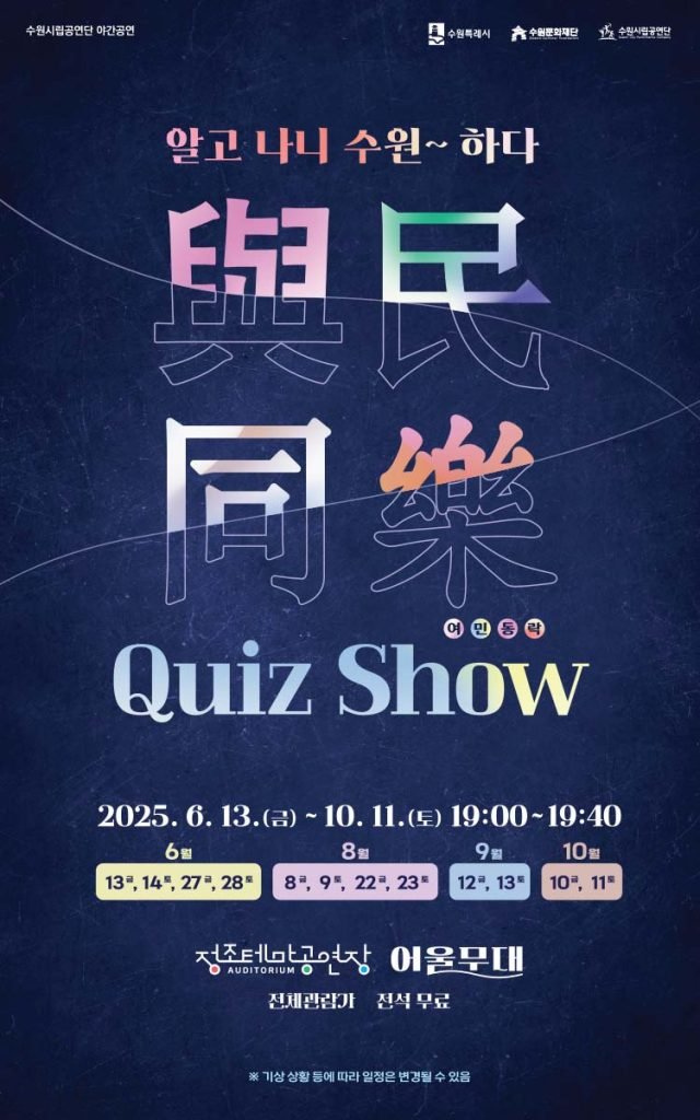 수원문화재단과 수원시립공연단이 오는 6월 13일부터 10월 11일까지 정조테마공연장 야외 어울무대에서 뮤지컬드라마 형식의 야간 공연 *‘여민동락 퀴즈쇼 <알고나니 수원~하다>’*를 선보인다. 이번 공연은 매회 오후 7시에 진행되며, 여름부터 가을까지 총 12회에 걸쳐 펼쳐질 예정이다.