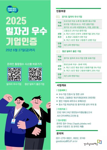 경기도와 경기도일자리재단이 오는 27일까지 ‘경기도 일자리 우수기업’과 ‘청년 일하기 좋은 기업’ 인증을 받을 기업을 모집한다.