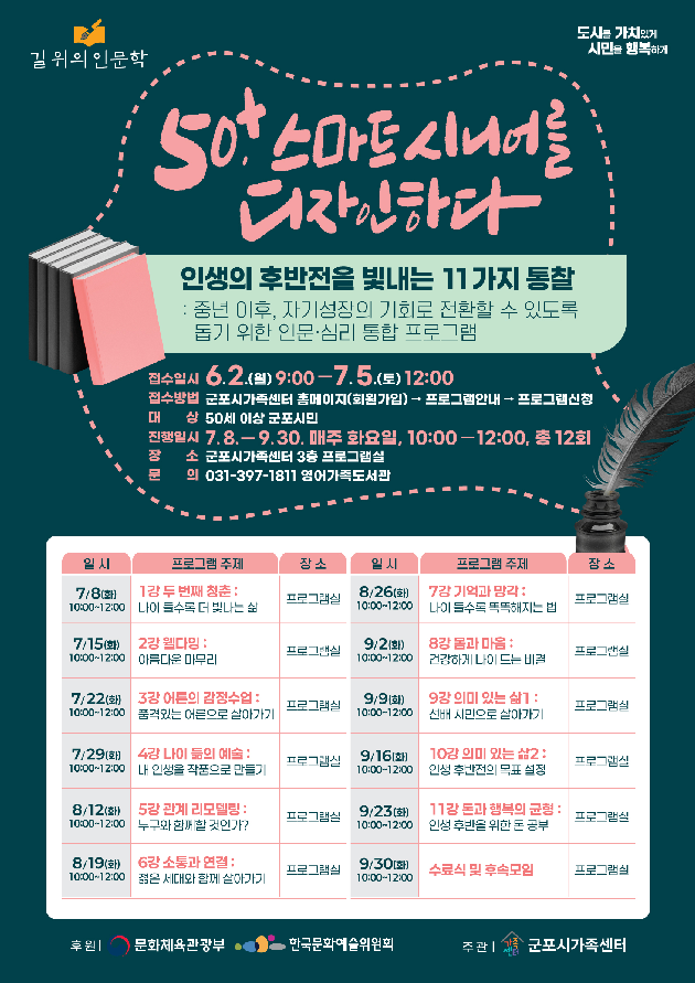 군포시가족센터는 오는 7월 8일부터 9월 30일까지 50대 이상 군포 시민을 대상으로 인문학 기반 교육 프로그램 ‘50+, 스마트 시니어를 디자인하다:인생의 후반전을 빛내는 11가지 통찰’을 운영한다.