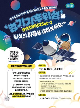도는 위성 개발에 대한 도민의 관심과 참여를 높이기 위해 6월 16일부터 23일까지 ‘이름 각인 이벤트’를 실시한다고 밝혔다. 참여를 원하는 도민은 전용 홈페이지(climate.gg.go.kr/event)를 통해 신청할 수 있다.