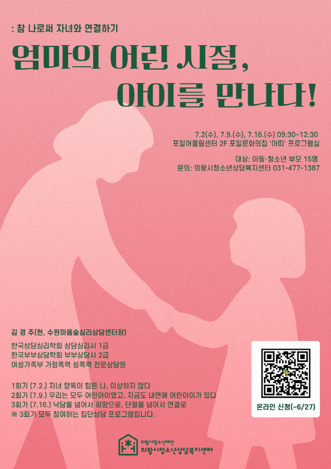 의왕시청소년상담복지센터는 오는 7월 2일부터 16일까지 매주 수요일, 부모 대상 집단상담 프로그램 ‘엄마의 어린 시절, 아이를 만나다’를 운영한다고 밝혔다.