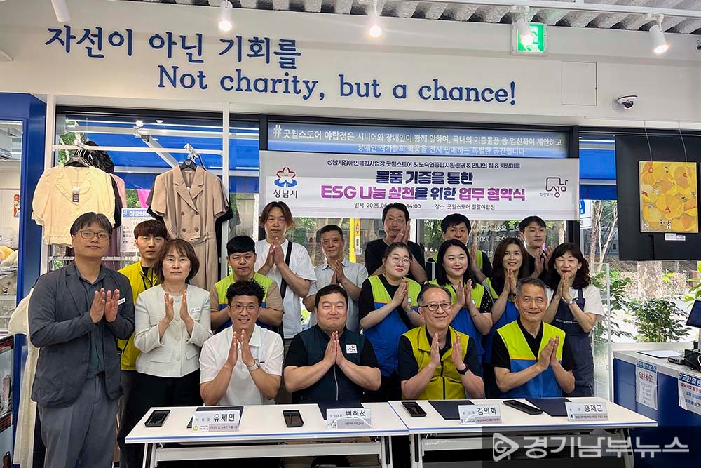 성남시가 기증받은 의류를 활용해 장애인의 일자리 창출과 노숙인의 자립을 동시에 지원하는 선순환 복지사업을 본격 추진한다.시는 24일 오후 야탑동 굿윌스토어(장애인 직업재활시설)에서 노숙인종합지원센터, 안나의집 등 5개 기관과 ‘ESG 나눔 실천–기증 의류 선순환 사업’ 협약을 체결했다고 25일 밝혔다. 이번 협약은 환경 보호와 사회적 약자의 상생을 함께 실현하는 ESG(환경·사회·지배구조) 모델로 주목된다.