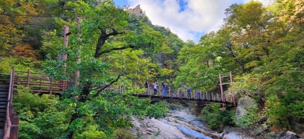 원통을 지나다가 맛집 송희식당에서 맛있는 점심을 먹었다. 부지런히 차를 이동해 한계령 휴게소를 넘어 드디어 흘림골에 도착했다. 주차는 흘림골 주차장에 했고 요금은 무료다. 등산을 시작했다. 1:40분 흘림골탐방지원센터를 통과했다. 가파른 구간을 올라 여심폭포와 등선대 정상까지 올랐다. 와~우~ 정말 아름다웠고 장관이었다. 가파른 내리막 구간을 지나 오색약수 방향으로 가는 내내 눈과 귀 그리고 마음까지 행복했다. 감탄사가 절로 나왔다. 작년 1월 오색약수터에서 대청봉을 아들과 같이 다녀왔던 기억이 났다. 기회 되면 설악산 귀때기청봉 1578m구간도 가볼까 한다.