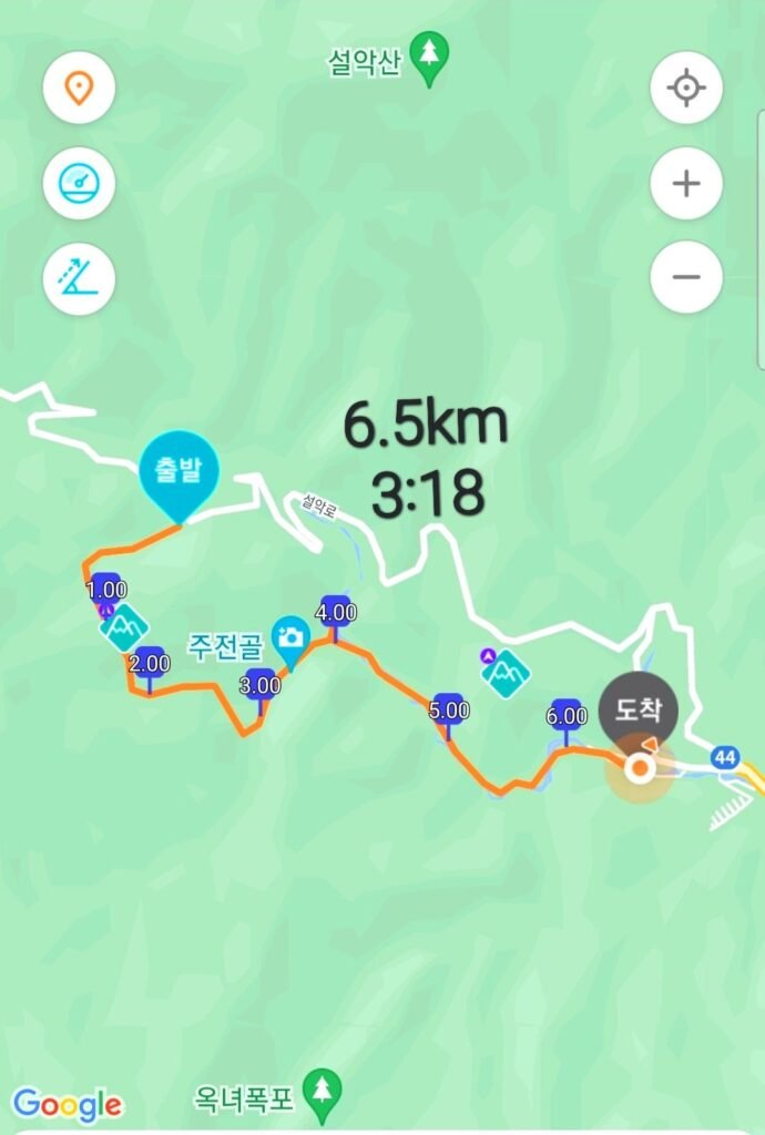 흘림골탐방지원센터-여심폭포-등선폭포-십이폭전망대-십이폭포-주전폭포-주전골-용소분기점-용소폭포-용소폭포삼거리-금강문-선녀탕-성국사-약수터탐방지원센터-오색약수-토박이식당.