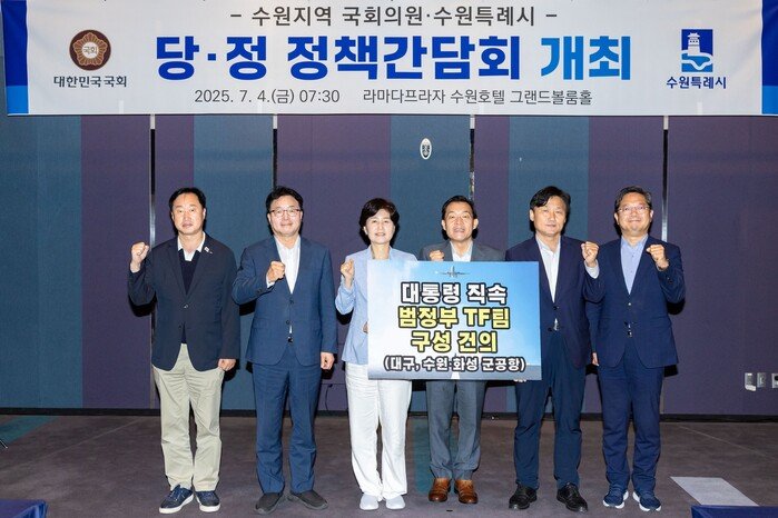이재준 시장과 수원 국회의원들은 4일 라마다프라자수원호텔에서 당정 정책간담회를 열고,기획재정부·국방부·국토교통부·경기도·수원시·화성시 등 6자가 참여하는 수원·대구 군공항 이전TF(태스크포스)구성을 건의하기로 했다.