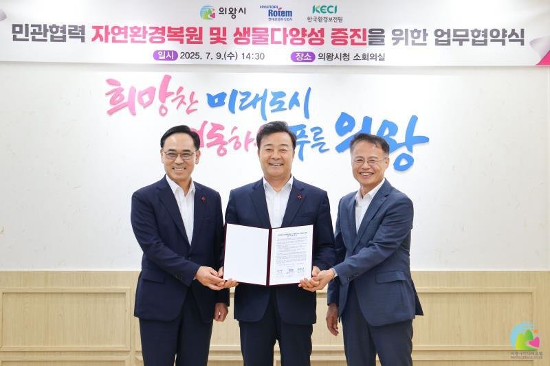 이를 위해 의왕시는 먼저 현대로템(주) 및 한국환경보전원과 ‘자연환경복원 및 생물다양성 증진을 위한 업무협약’을 9일 체결헀다.