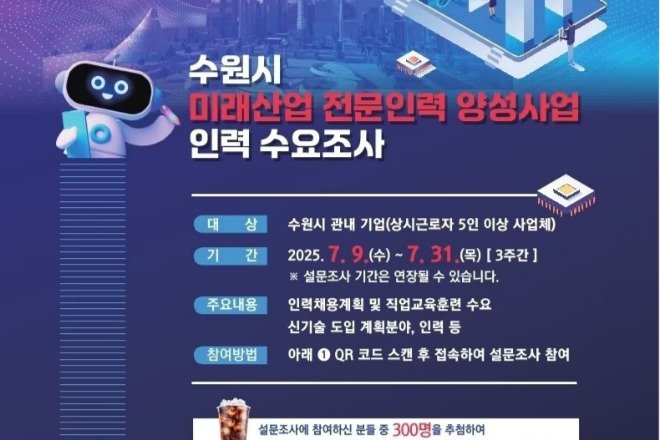 수원시와 경기인적자원개발위원회가 협력해 진행한다. 조사 대상은 관내 상시근로자 5인 이상 사업체다. ‘수원시 미래산업 전문인력 양성사업 인력 수요조사’ 포스터에 있는 큐알(QR) 코드로 접속해서 설문조사에 참여하면 된다.
