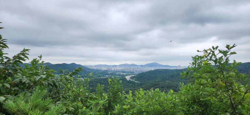 인천대공원 내 백범 광장을 가로질러 이번에는 관모산으로 향하는 급경사를 다시 올랐다. 땀은 그칠 줄 모르고 비 오듯 쏟아졌지만, 마침내 도착한 관모산(162m) 정상에서의 조망은 그야말로 일품이었다. 뒤를 돌아보니, 제가 넘어온 성주산과 거마산의 능선이 U자 형태로 선명하게 펼쳐져 있었다.