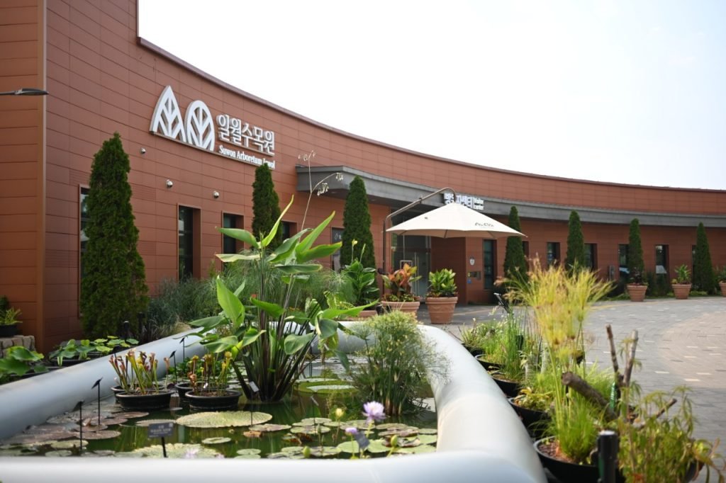 여름철 수생식물을 만날 수 있는 수원 일월수목원의 건물 전경.