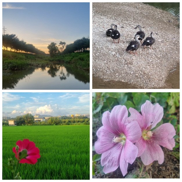 황구지천길에 오리떼와 예쁜 접시꽃 사진: 김정옥, 경기남부뉴스