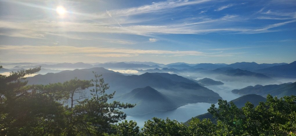 새벽 어스름이 채 가시지 않은 5시, 충주 마즈막재 주차장에 도착하니 눈앞에 펼쳐진 풍경에 저절로 탄성이 터져 나왔다. 병풍처럼 둘러선 산봉우리 위로 충주호가 고요히 잠들어 있고, 그 위로 아침 햇살이 스며들며 빚어내는 장관은 이루 말할 수 없었다. 한참을 넋 놓고 바라보다 드디어 계명산 산행을 시작했다.