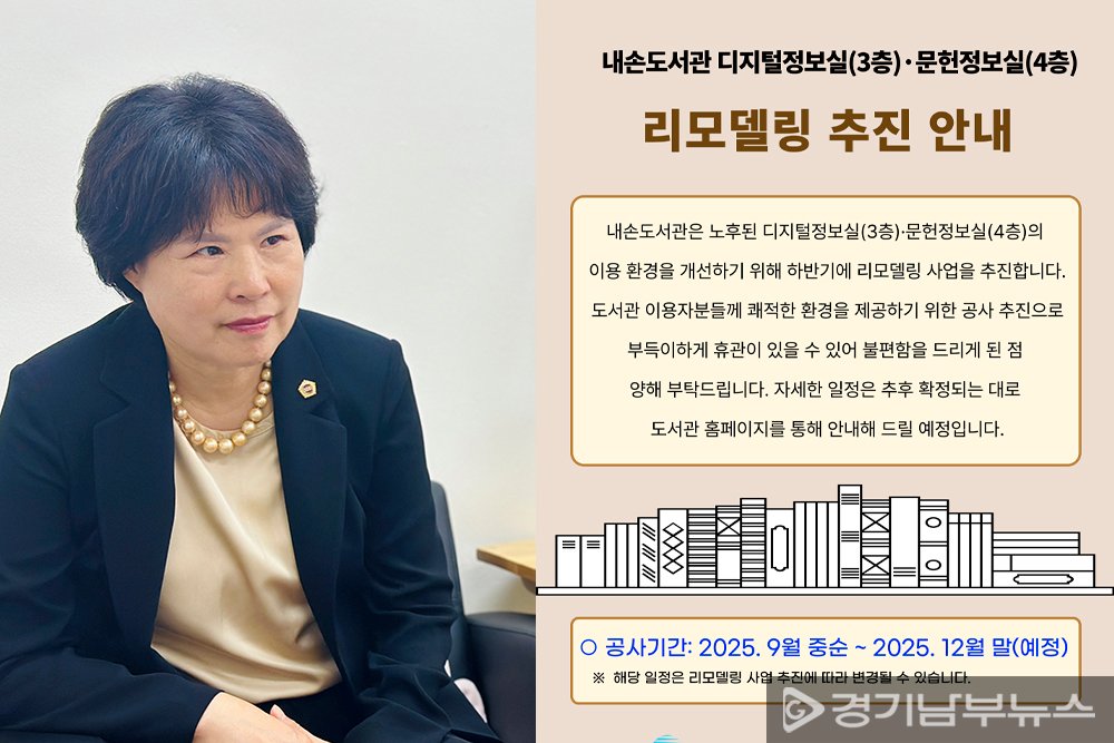 이번 리모델링 사업은 서성란 의원이 확보한 특별조정교부금 13억 원을 포함한 총 17억 400만 원 규모로 추진되며, 사업 대상은 내손도서관 3·4층 문헌정보실과 디지털정보실이며, 공간 통합 및 기능 재구성을 통해 시민이 체감할 수 있는 쾌적한 독서환경 조성을 목표로 하고 있다.
