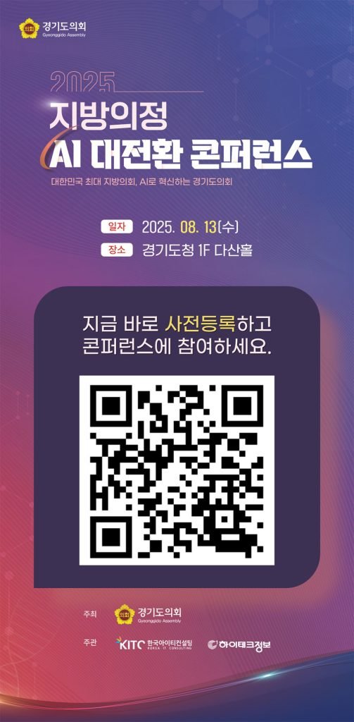 한편, 이번 콘퍼런스는 경기도의회 공식 유튜브를 통해 전 과정이 실시간으로 생중계될 예정이며, 행사에 참여하려면 사전등록 사이트(https://inviteme.kr/2025GGD-AI/) 또는 QR 코드를 통해 신청하면 된다.