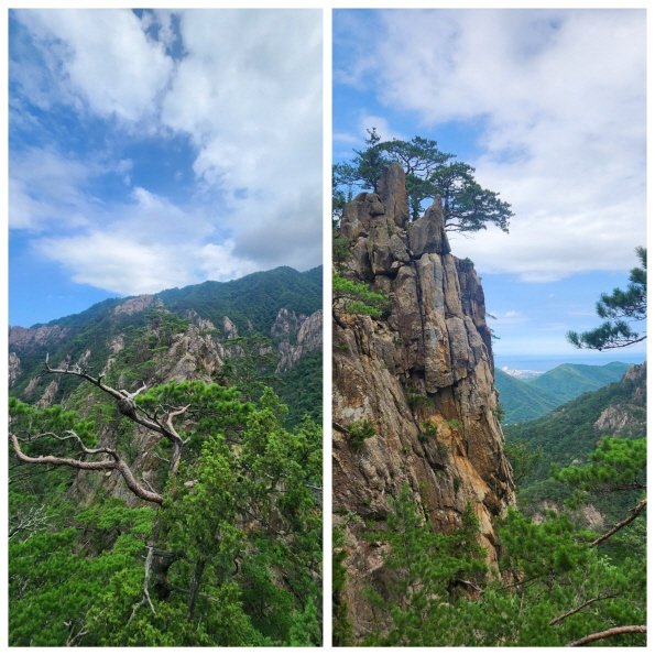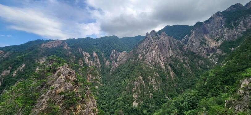 드디어 전망대에 도착했을 때, 기대했던 토왕성폭포는 일부만 가늘게 보일 뿐이었다. 살짝 아쉬움이 남았지만, 주변 풍경이 그 아쉬움을 덜어주었다. 산과 하늘, 그리고 발아래 펼쳐진 자연의 조화가 더없이 웅장했다.