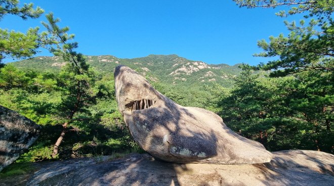 은행나무 분기점에 와서 이번에는 다른 길을 택해 망탑과 상어바위 방향으로 올라간다. 상어바위 앞에 오니 아내가 바위에 누워 하늘을 바라보고 친구는 옆에 앉아 있다. 천태산은 못 오르고 둘이서 상어바위까지는 올라와 있었다. 상어 밥이 되면 안 돼! 농담으로 이야기를 하니 다 한바탕 웃는다. 내려오는 길이 경사가 지고 가파르긴 했지만, 계곡을 잠시 걸을 수 있었다. 주차장에 도착해 젖은 옷을 갈아입고 15분 거리에 있는 월영산 출렁다리로 이동을 한다.