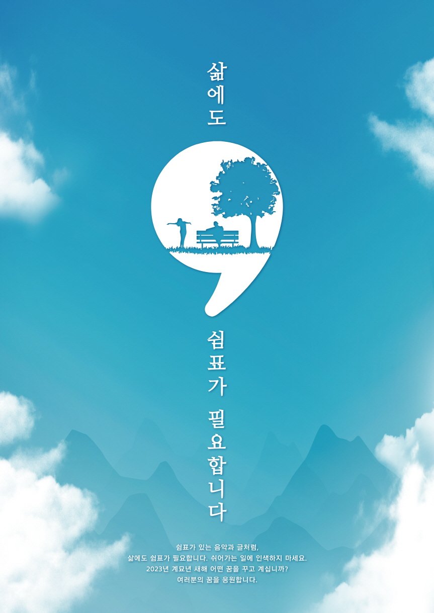 쉼표가 있는 음악과 글처럼, 삶에도 쉼표가 필요합니다. 쉬어가는 일에 인색하지 마세요. 2023년 계묘년 새해, 여러분의 꿈을 응원합니다.