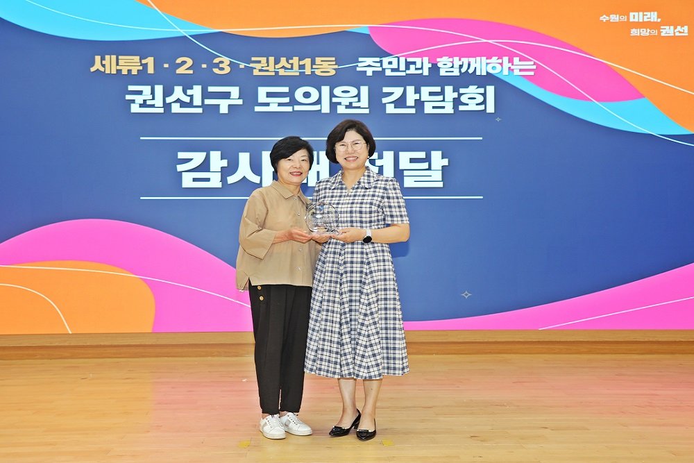 특히 이날 간담회에서는 권선구 발전에 기여한 공로를 인정해 주민들이 이애형 위원장에게 감사패를 전달하는 뜻깊은 시간도 마련됐다. 이는 평소 현장 중심의 소통과 지역발전을 위한 꾸준한 노력에 대한 주민들의 감사의 뜻이 담긴 것이다.