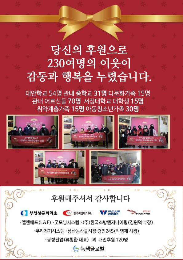 부천 비영리민간단체 녹색글로벌(대표 허택)은 '키다리 아저씨 프로젝트'로 기업과 단체, 개인의 후원을 받아 문화취약계층을 12월 13~14일에 인천문화예술회관에서 개최된 크리스마스 칸타타 공연에 초대했다.