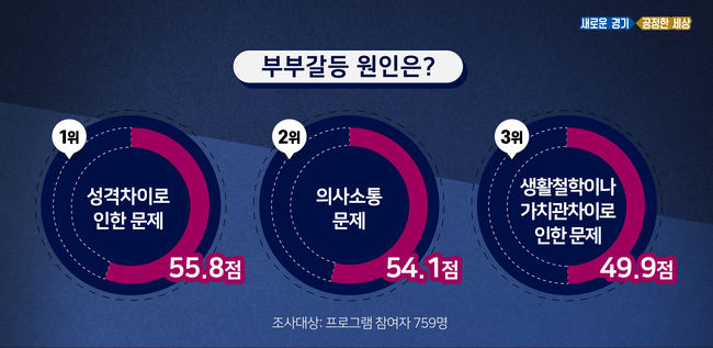 이밖에 이들이 꼽은 부부 갈등 내용(이유)으로는 100점 만점 환산 시 ‘성격 차이로 인한 문제’가 55.8점으로 가장 높게 나타났다. 이어 ‘의사소통의 문제’(54.1점), ‘생활철학이나 가치관 차이로 인한 문제’(49.9점), ‘가정의 재정 관리 문제’(45.5점) 등의 순이다.