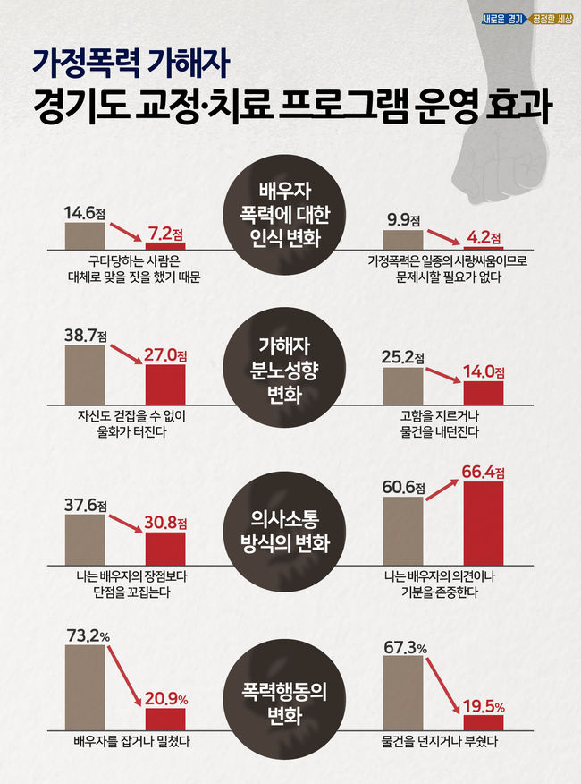 경기도가 가정폭력 가해자를 대상으로 실시하는 ‘교정·치료 프로그램 운영 사업’이 잘못된 폭력 인식 개선이나 폭력 행동 감소에 효과가 있다는 설문조사가 나왔다.