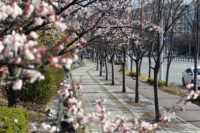 수원시 권선2동 공동주택단지 주변에 조성된 자전거도로에 봄을 알리는 꽃이 피었다.
