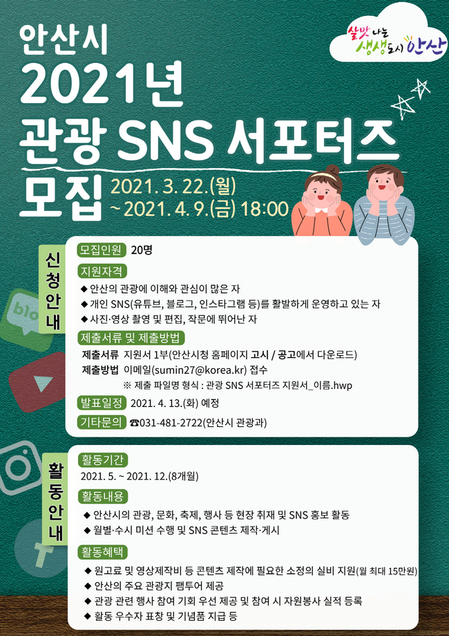 관광 서포터즈 지원서 및 자세한 내용은 안산시 홈페이지를 통해 확인할 수 있으며, 궁금한 사항은 안산시 관광과로 문의하면 된다.
