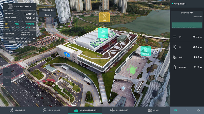 센터 내 신재생에너지 발전량 현황과 건물에서 사용하는 냉난방기·조명·엘리베이터 등의 실시간 전력수요 현황, 회의실 공기 질 등을 볼 수 있다.